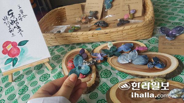 허 회원은 "이것을 미리 주워다가 베이킹소다로 잘 씻고 다듬고 말려서 장만해 놓은 자연소재 동백씨방에 미리 핀을 붙여놓고 탐방객들이 와서 아크릴 물감이나 메니큐어 등으로 색감을 자유롭게 만들어내면 자신만의 브로치가 된다"고 설명했다.