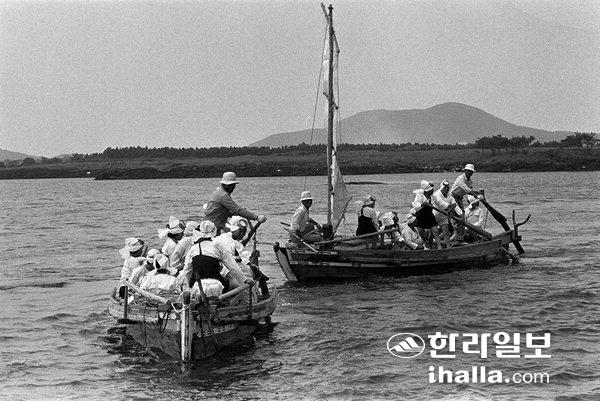 사진집의 첫 장은 '참으로 오래 전' 어느날 제주시 조천읍 북촌리 다려도 앞바다의 풍경으로 열린다. 10여 척의 배에 나눠 탄 해녀들이 바다로 향하는 사진이다. 마침 그 주변을 서성거리고 있는 그는 헐레벌떡 해안가로 달려가 카메라를 들었다. 망원렌즈가 없어 몸소 피사체에 가깝게 다가가야 했던 시절이다.