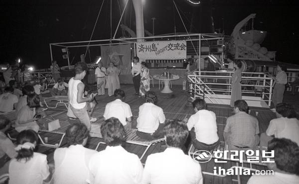 1989년 8월 제주를 찾은 코럴프린세스호 선상에서 한국인과 피스보트 회원들이 교류회를 벌이고 있다.