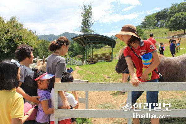 어린이들이 범산목장에서 체험프로그램을 즐기고 있다.