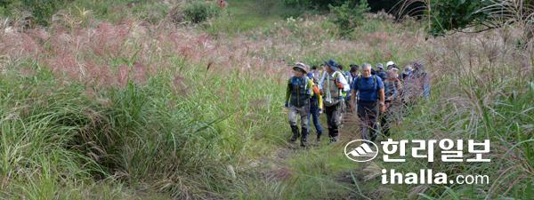 지난달 22일 제10차 제주섬 글로벌 에코투어가 진행된 가운데 참가자들이 억새밭을 거닐며 가을 정취를 만끽하고 있다. 강희만기자