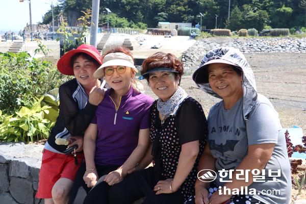 왼쪽부터 강춘금·고종순·강영옥·강순옥 해녀가 호도 선착장 인근에서 기념촬영을 하고 있다.