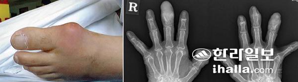 왼발 중족지 관절에 생긴 급성통풍관절염(사진 왼쪽). 특징적으로 이환된 관절이 붓고, 붉어지는 염증소견을 보인다. 만성 결정성 통풍환자의 손(사진 오른쪽). 단순 방사선검사 소견으로 손가락 원위지관절로 통풍결절이 침범돼 특징직인 골미란(뼈가 녹아나는 현상)이 관찰된다.
