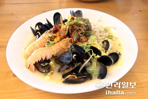 나가사키 짬뽕처럼 흰 국물이 특징인 흑돼지해물라면.