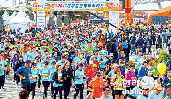 지난해 서귀포시 월드컵 경기장에서 열린 2017제주감귤국제마라톤 출발 모습.