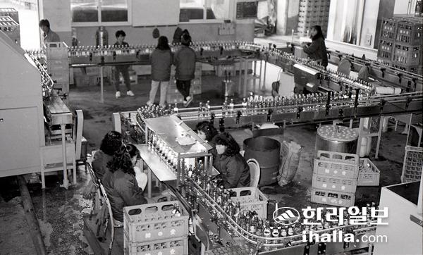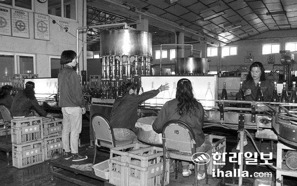 한라산의 전신인 한일소주 공장에서 직원들이 제품을 생산하고 있다. 사진=강희만 기자 photo@ihalla.com