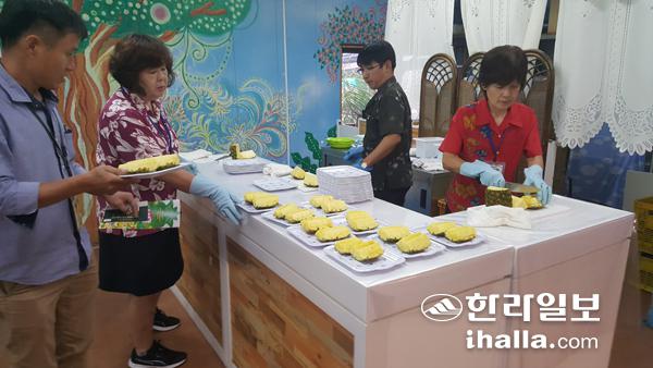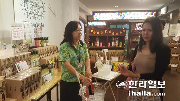 파인애플 공장 판매점에서 직원이 가공식품을 판매하고 있다