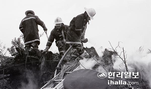소방관들이 초가 화재 현장에 출동해 진화작업을 벌이고 있다. 당시에는 방화복 성능도 현재보다 좋지 못했을 뿐 아니라 공기호흡기가 개인별 보급이 되지 못해 일부 소방관만 장착하고 있는 모습이 보인다. 강희만 기자 photo@ihalla.com