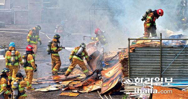 소방관들이 호스를 화재가 난 곳 가까이에 가져가 불을 끄고 있다. 강희만 기자 photo@ihalla.com