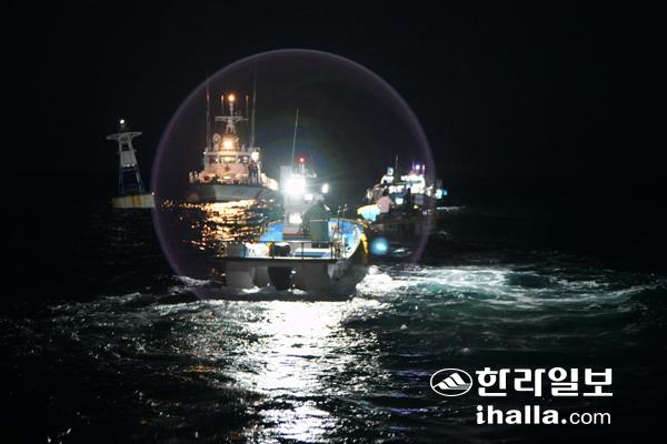 저도 어장에 들어가기 위해 점호를 받고 있는 어선들.