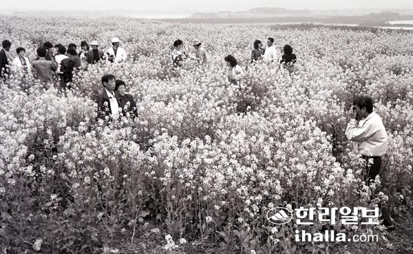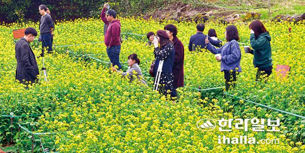 서귀포시 성산읍 성산일출봉 인근 유채꽃밭에서 관광객들이 기념사진을 촬영하며 즐거운 시간을 보내고 있다.