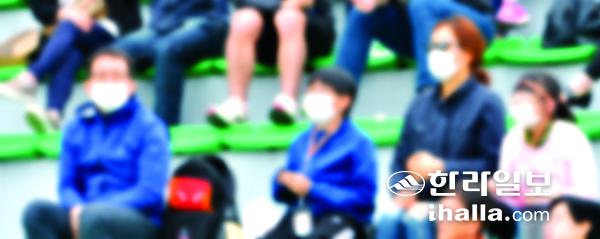 축구경기장을 찾은 관람객들이 마스크를 착용한 채 축구 경기를 지켜보고 있다. 사진=한라일보DB