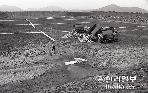 1992년부터 쓰레기 반입이 시작된 봉개 매립장에 트럭이 쓰레기를 쏟아붓고 있다. 강희만 기자