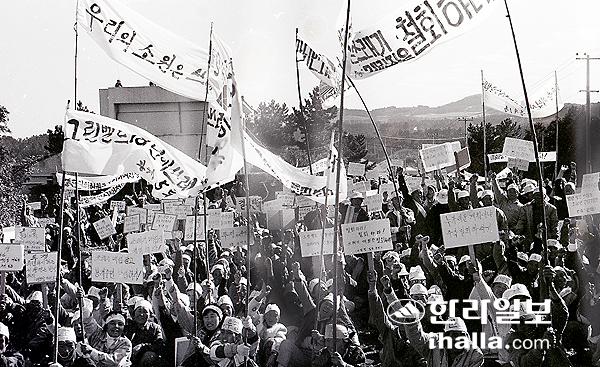 1990년 봉개 매립장 조성 전 지역주민들이 생활환경오염 우려 등을 이유로 반대집회를 벌이고 있다. 강희만 기자