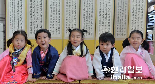 "까치 까치 설날은 어저께고요, 우리 우리 설날은 오늘이래요. 곱고 고운 댕기도 내가 드리고, 새로 사온 신발도 내가 신어요~."