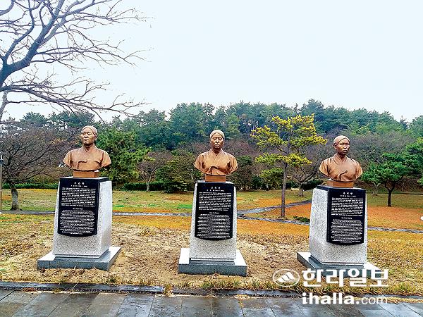 구좌읍 하도리 연두망동산에 세워진 해녀운동 주역 조형물.
