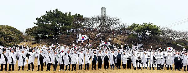 지난해 3월1일 제주시 조천읍 만세동산에서 열린 기미독립운동 99주년 기념 및 제26회 조천만세대행진 행사에서 참가자들이 3·1독립운동기념탑 앞에서 대한독립 만세를 외치고 있다. 사진=한라일보 DB