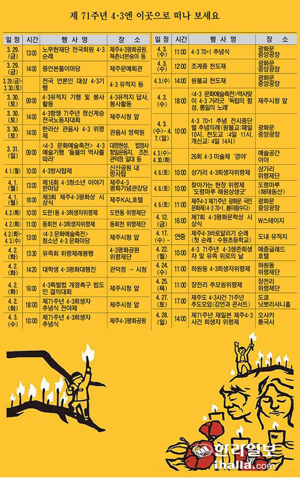 이제 곧 4월이다. 꽃피는 봄날, 제주시 도심 해원상생 굿판 등 4·3을 기억할 수 있는 곳을 찾아 떠나보자. 4월 한달 동안 4·3이 현재와 동떨어진 과거가 아님을 말해주는 추념 행사가 잇따른다. 제주에 발디딘 여행객들이 일출을 보기 위해 무심히 바위를 오르고 바다에서 모래 장난을 하는 그곳에 배인 '잔인한 기억'이 하나둘 지워지기 전에 4·3 71주년을 맞는 오늘, 그 날을 잊지 말자고 마음에 새겨볼 일이다.