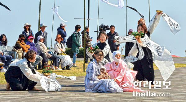 지난해 4·3평화공원에서 치러진 4·3 70주년 해원상생굿 추모 퍼포먼스. 올해는 잊혀진 4·3 학살터인 제주시 도심 도령마루로 향한다