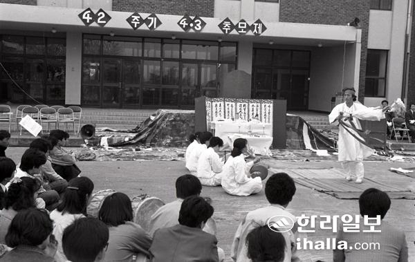 1990년 제주지역 11개 시민사회단체가 공동으로 4월제 공동준비위원회를 결성하고 제주시민회관에서 제42주기 4·3추모제를 봉행했다. 강희만 기자
