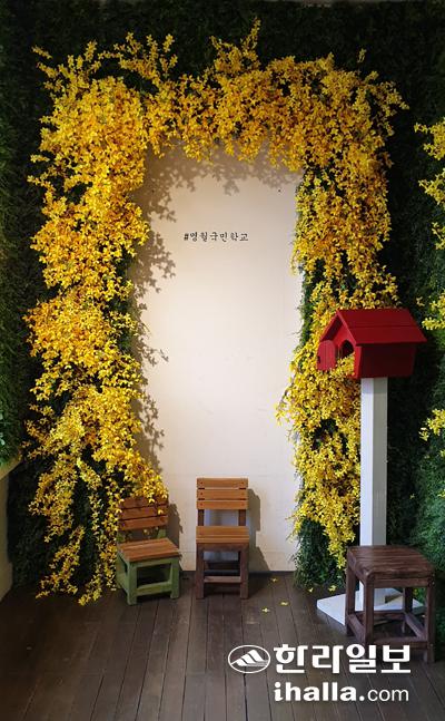 넝쿨과 개나리 등으로 이쁘게 꾸며놓은 포토존.