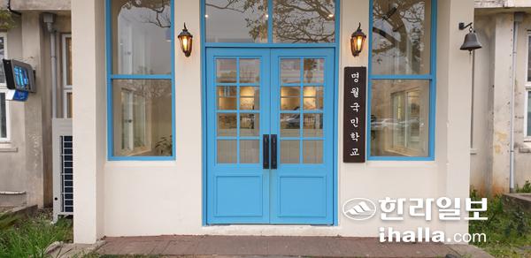 SNS를 통해 제주 이색카페로 유명한 명월국민학교. 파란 대문은 이곳의 대표적인 포토존이다. 오은지기자