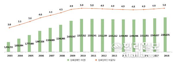 2018년 말 기준 등록장애인은 258만6000명(전체 인구 대비 5.0%)으로 나타났다.