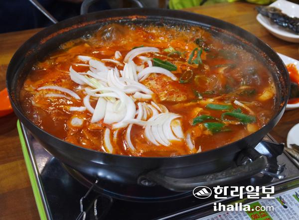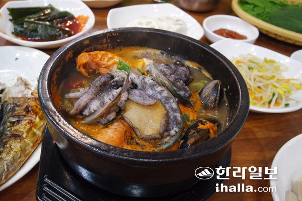 주인장에게 갈치조림 정식과 고등어 구이를 부탁했다. 그러자 테이블에는 빨간 국물 속에 싱싱한 갈치가 토막이 난 채로 퐁당 담겨져 있었다. 이어 김이 모락모락 나는 전복뚝배기(정식 포함 요리)와 고등어구이가 나왔다. 뚝배기 안에는 큼직한 전복과 조개, 새우 등이 된장 베이스 육수에 빠져있었고, 고등어구이는 유연한 몸매가 그대로 살아있는 상태로 노릇노릇 구워져 있었다