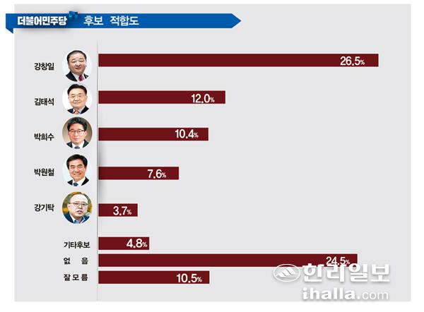 더불어민주당 제주시갑 국회의원 후보 다섯명 중 누가 가장 적합하다고 생각하는지 조사한 결과도 현직인 강창일 후보가 26.5%로 1위를 기록했다. 이어 김태석 후보(12.0%), 박희수 후보(10.4%), 박원철 후보(7.6%), 강기탁 후보(3.7%) 순으로 나타났다. '기타 후보'는 4.8%, '없음'은 24.5%, '잘모름'은 10.5%였다. 역시 부동층이 35%에 달해 당내 경선 과정에서부터 누가 먼저 숨은 표심을 잡느냐에 따라 최종 후보가 결정될 것으로 보인다.