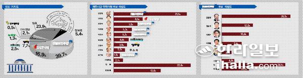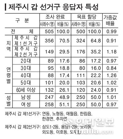 이번 여론조사는 한라일보가 여론조사 전문기관인 리얼미터에 의뢰해 지난 17일부터 사흘간 제주도에 거주하는 만 19세 이상 남녀 1525명을 대상으로 진행했다. 전체 표본 중 남자는 787명(51.6%), 여자는 738명(48.4%)이며. 연령별로는 19~29세 251명(16.5%), 30대 269명(17.6%), 40대 275명(18.0%), 50대 295명(19.3%), 60세 이상 435명(28.5%)이다. 지역별로는 제주시 갑선거구 505명(33.1%), 제주시 을선거구 512명(33.6%), 서귀포시 508명(33.3%)이다.