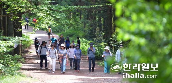 25일 오전 서귀포시 표선면 남조로변 붉은오름 입구 특설무대에서 '2019 산림문화체험 사려니숲 에코힐링 체험' 행사가 개막해 도민과 관광객들이 숲길을 걷고 있다. 강희만기자