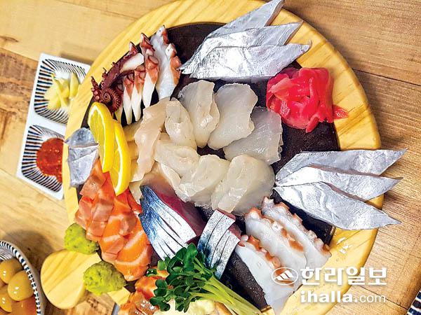 우선 사이드 디시가 메인 메뉴만큼 한상 푸짐하게 차려진다. 육지에서 맛보기 힘든 고소한 갈치회와 부드러운 연어회, 쫄깃한 문어숙회, 도톰한 광어회, 그리고 입안에서 살살녹는 고등어회 등을 한 접시에 올린 회모듬이 들어온다.
