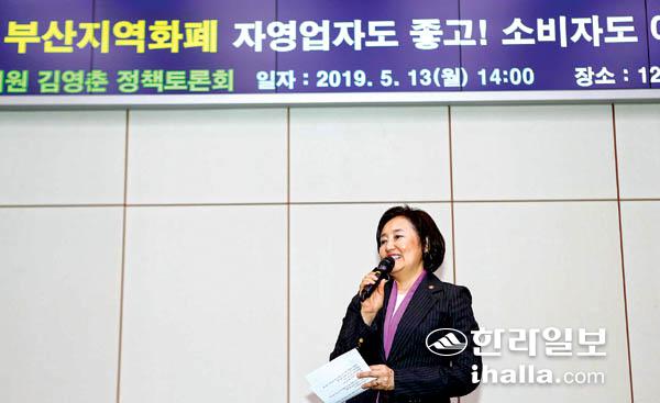 지난 5월 13일 부산시청에서 더불어민주당 김영춘 의원이 '부산지역화폐 도입 방안'을 주제로 마련한 정책토론회에서 축사하는 박영선 중소벤처기업부 장관. 연합뉴스