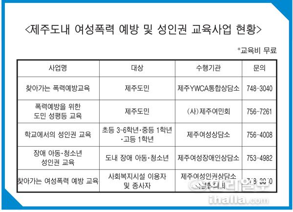 대상별 프로그램은 ▷일반 도민을 대상으로 '찾아가는 폭력 예방교육(제주YWCA 통합상담소)', '폭력 예방을 위한 도민 성평등교육(제주여민회)' ▷사회복지시설 이용자와 종사자들을 대상으로 '찾아가는 여성폭력 예방교육(제주여성인권상담소·시설협의회)' 등이다. 아동·청소년 대상으로는 성인지적 관점에서 성교육 및 성폭력·가정폭력·성매매·성희롱 예방교육 등을 통합해 '학교 성 인권교육(제주여성상담소)'과 '장애 아동·청소년 성인권 교육(제주여성장애인상담소)'이 진행될 예정이다.