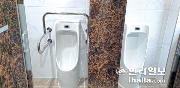 남성용소변기에 문이 있는 칸막이를 설치했다.