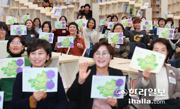 2월 14일 서울 동작구 대방동 서울여성플라자 성평등도서관 '여기'에서 열린 '서울시 여성리더와 함께 하는 신년회'에서 참석자들이 서울시 지도에 성평등 메시지를 적은 뒤 함께 들어보이며 구호를 외치고 있다.