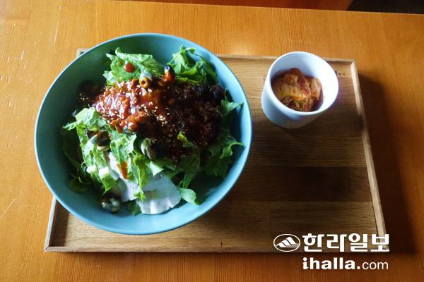 이밖에도 비빔국수에는 얼음물에 데쳐 쫄깃한 소면과 돔베고기, 보말, 상추, 깻잎, 오이 위에 새콤한 초장 소스가 올려졌는데, 고기의 육감과 보말의 바다 내음이 충돌하지 않고 입 안에서 잘 어우러졌다.