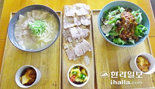 한문승 사장에게 고기국수와 비빔국수, 돔베고기를 부탁했다. 그러자 테이블에는 얇게 썬 돔베고기가 도마처럼 생긴 나무접시에 담겨져 나왔다. 이어 김이 모락모락 나는 고기국수와 보기에도 상큼해 보이는 비빔국수도 테이블 위에 올려졌다.