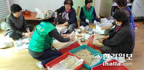 지난해 열린 향토음식체험 축제에서 와흘리 어르신들이 메밀을 이용해 음식을 만들고 있다. 사진=와흘메밀마을 제공