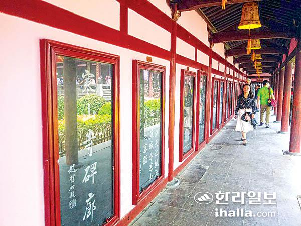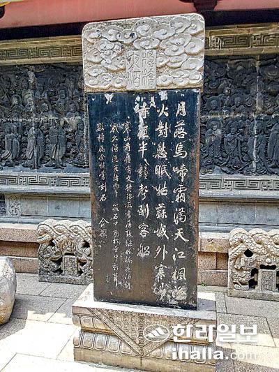 사찰 내부는 온통 시인 장계(張繼)가 쓴 시로 뒤덮여있었다. '풍교야박(楓橋夜泊)'이다. '달 지고 까마귀 우는데 하늘엔 서리 가득(月落烏啼霜滿天)/ 강가 단풍나무와 배의 등불 바라보다 시름에 겨워 잠드는데(江楓漁火對愁眠)/ 고소성 밖 한산사(姑蘇城外寒山寺)/ 한밤중에 울리는 종소리 객선까지 들려오누나(夜半鐘聲到客船)'란 시의 구절이 탁본이나 빗돌에 새겨져 곳곳에 놓여있었다.