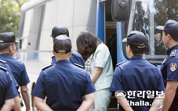 제주에서 전 남편을 살해한 혐의로 구속기속된 고유정이 16일 오후 세 번째 재판을 받기 위해 호송차에서 내리고 있다. 고씨는 이날도 머리로 얼굴을 가린채 법원으로 들어갔다. 이상국기자