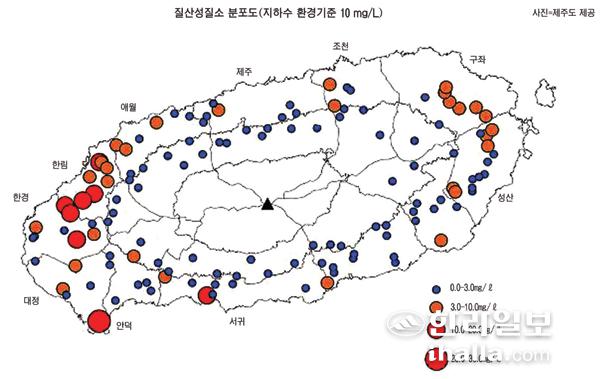 제주도보건환경연구원이 올해 지하수 관정 133개소를 대상으로 수질검사를 실시한 결과, 오염지표 항목 중 질산성질소 농도가 지하수 환경기준(환경정책기본법)인 10㎎/ℓ를 초과한 관정은 서부지역 7개소, 남부지역 1개소 등 총 8곳으로 조사됐다. 질산성질소 농도는 서부 5.3㎎/ℓ, 동부 2.3㎎/ℓ, 남부 1.9㎎/ℓ, 북부 1.5㎎/ℓ순으로 조사됐다. 서부지역이 다른 지역보다 약 2~3배 높게 나타난 것은 농업 형태 및 집약된 축산업 영향인 것으로 보건환경연구원은 분석했다.