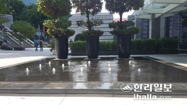 싱가포르 건물 주변에서는 재활용수를 이용한 분수대를 흔히 볼 수 있다. 분수대 뒤로 보이는 것이 싱가포르 대표적인 랜드마크인 마리나베이 샌즈호텔 전경. 고대로기자