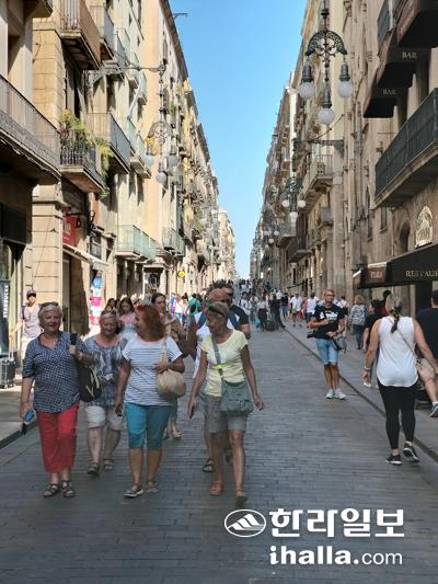수많은 관광객이 스페인 바르셀로나 람블라스 거리를 거닐며 관광을 즐기고 있다. 이상민기자