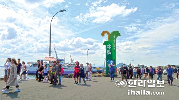 도항선이 우도에 도착하자 관광객들이 쏟아지듯 선박에서 나와 우도 관광에 나서고 있다.