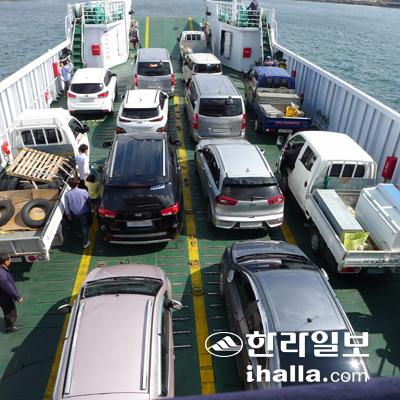 우도로 가는 도항선에 실린 10여대의 차량들. 이중 렌터카는 5대로 예전에 비해 크게 줄었다.