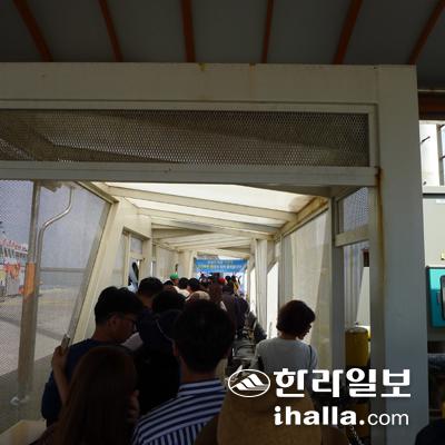 관광객들이 서귀포시 성산포항 종합여객터미널에서 우도로 가는 도항선을 타기 위해 줄지어 서 있다. 이상민기자
