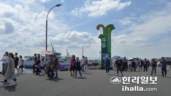 도항선이 우도에 도착하자 관광객들이 쏟아지듯 배에서 나와 우도 관광에 나서고 있다.