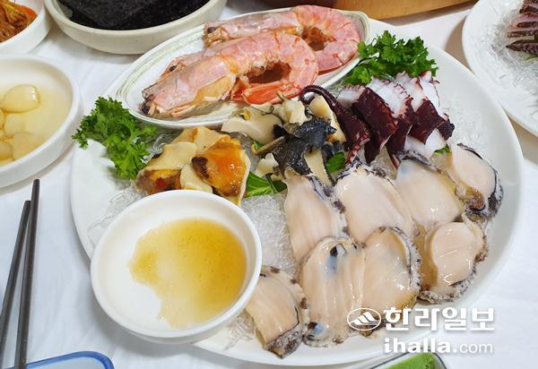 전복 새우 멍게 문어로 구성된 해산물 모듬.