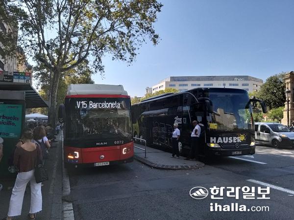 카탈루냐 광장에서부터 관광버스(사진 오른쪽)는 일반 버스(사진 왼쪽)가 다니는 맨 바깥쪽 차로에 진입하지 못하고 안쪽 차로에서 운행해야 한다. 또 관광버스는 람블라 거리 진입이 금지된다.